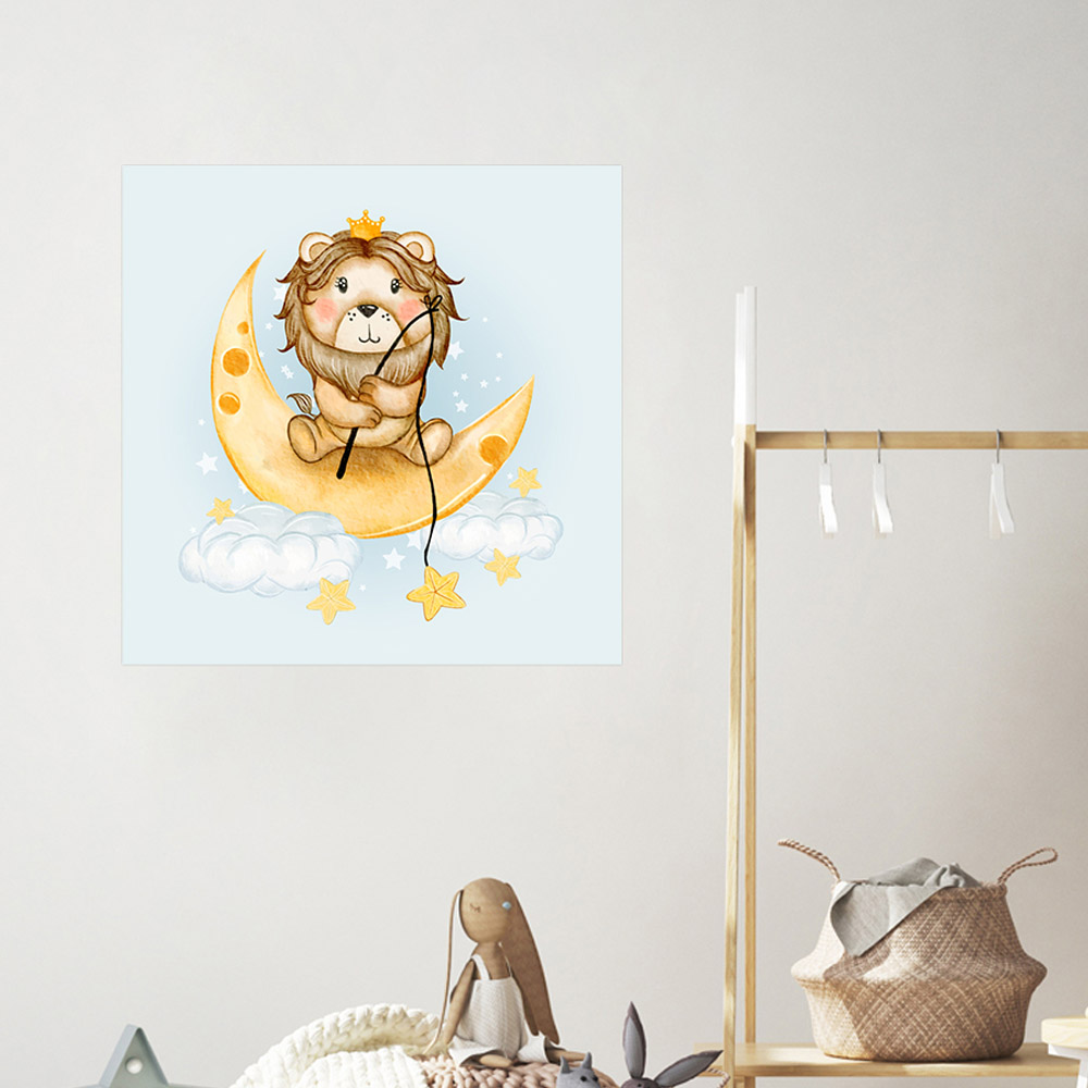 Çocuk odalarında neşeli duvarlar yaratmak istiyorsanız, duvarlarınızdaki boş alanlara biraz hareket katabilirsiniz. Sevimli hayvan tasarımlı Manyetix posterler bu konuda çocuk odası dekorasyon fikirlerinize ışık tutacak. Manyetix sevimli aslan çocuk odası posteri açık mavi bir zemin üzerinde aya oturmuş sevimli bir aslan teması üzerine tasarlanmıştır. Bununla birlikte sevimli aslan posterinde sarının ve mavinin huzur verici sakin tonları kullanılmıştır.
